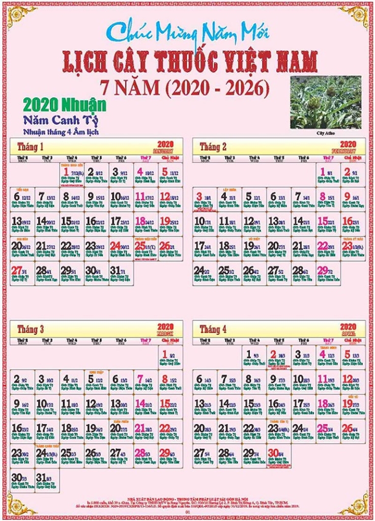 Lịch in mặt một về tra cứu ngày, tháng, năm. Mặt sau in về một số cây thuốc nam giúp mọi người dễ nhận biết và sử dụng các loại cây thuốc quý .