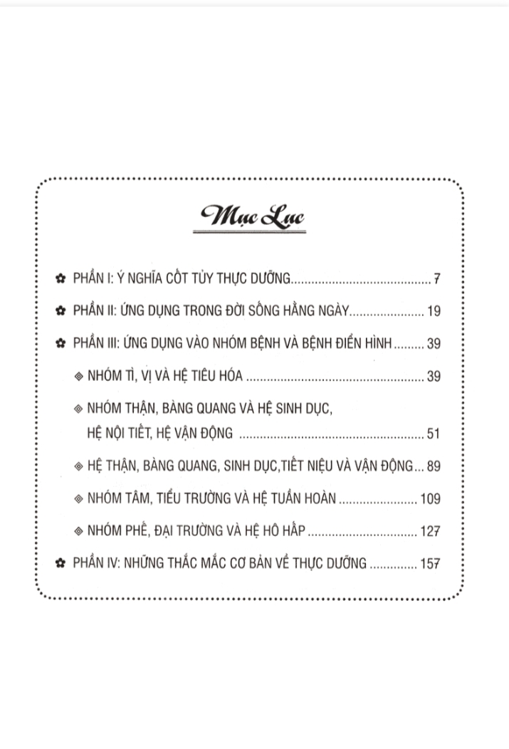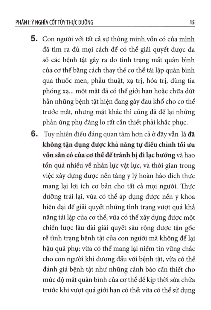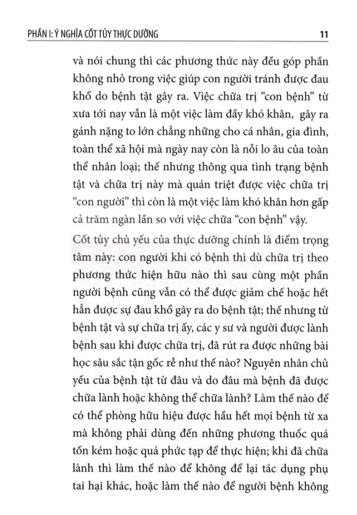 Một quan điểm khác biệt với những sách đã viết về thực dưỡng trước đây là : thực dưỡng không phải là một phương pháp chữa bệnh, không phân rạch ròi 7 cách ăn uống, đặt nhẹ việc phân biệt âm dương trong lưạ chọn thực phẩm và áp dụng vào thực tế sẽ hoàn toàn khác hẳn, trong thực tế thì không phải lúc nào cũng có thể dùng muối mè và không phải cà măng nấm là không bao giờ được dùng ...